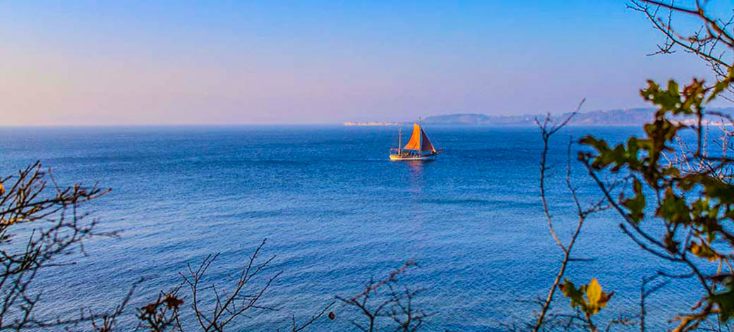 Zesenboot im Sonnenuntergang bei der Einfahrt in die Hagensche Wiek.