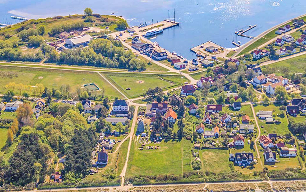 Luftaufnahme von dem OT Vitte mit dem Hafen auf der Insel Hiddensee.