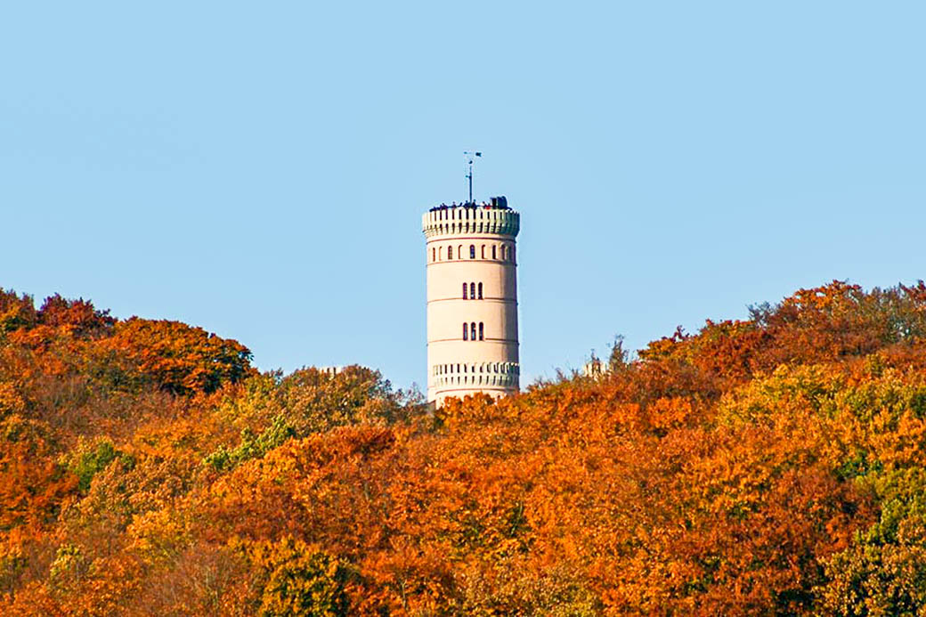 Der Turm des Jagdschlosses, hier im bunten Herbstlaub der Granitz, ist weithin sichtbar.