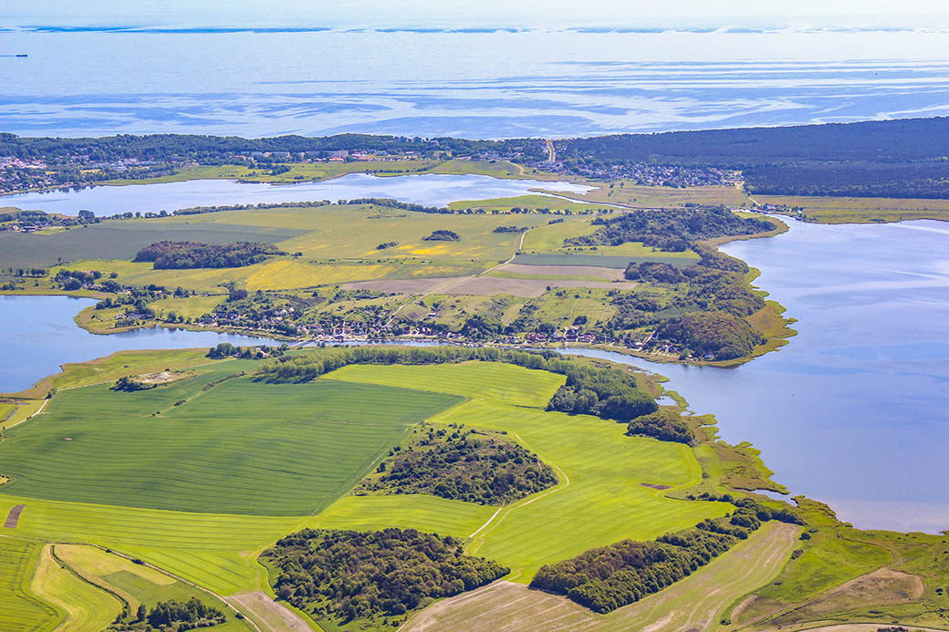 Rundflug: Das Nordufer von Wittow. Richtung Dranske mit Bug und Hiddensee.