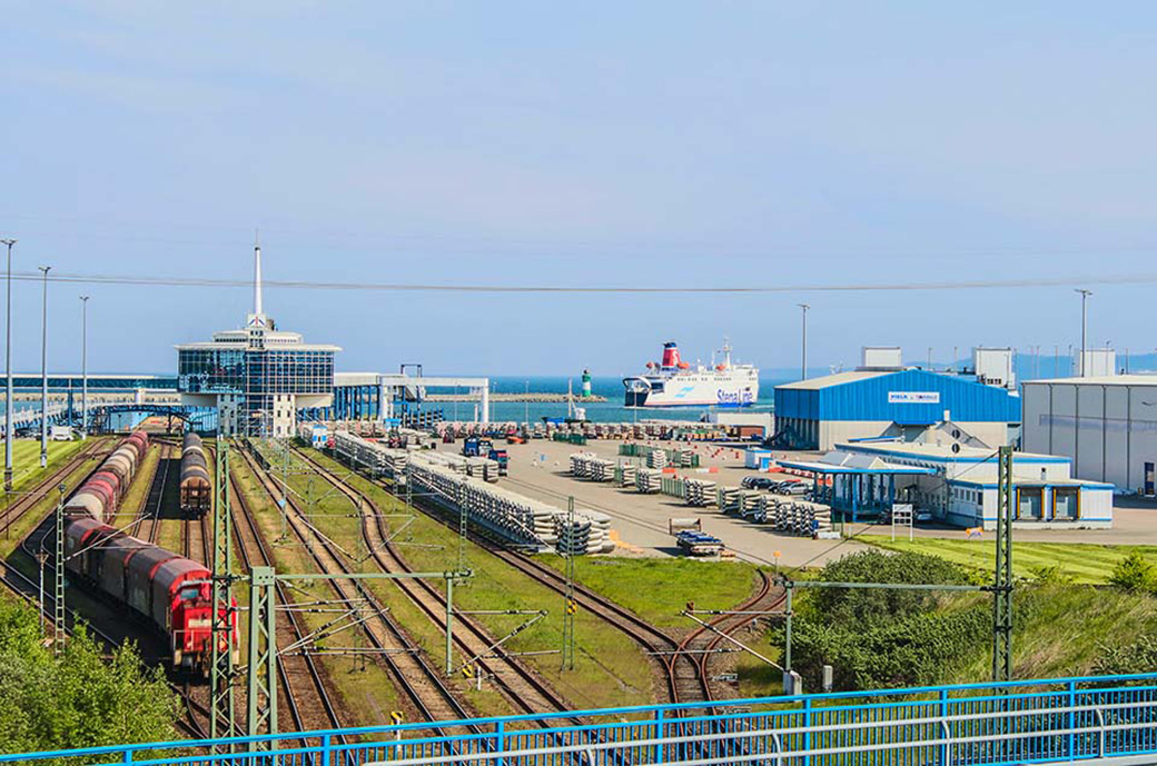 Terminal Mukran mit Fähranleger und einlaufender Fähre.