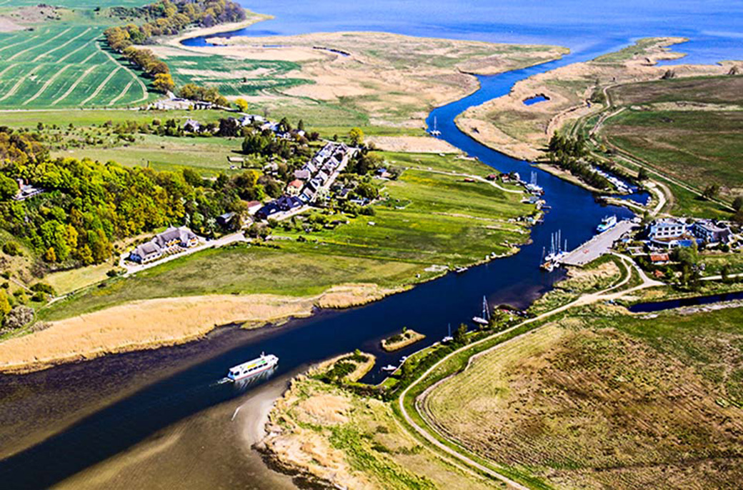 Der Thießower Hafen auf Mönchgut. Am Horizont die Insel Greifswalder Oie.