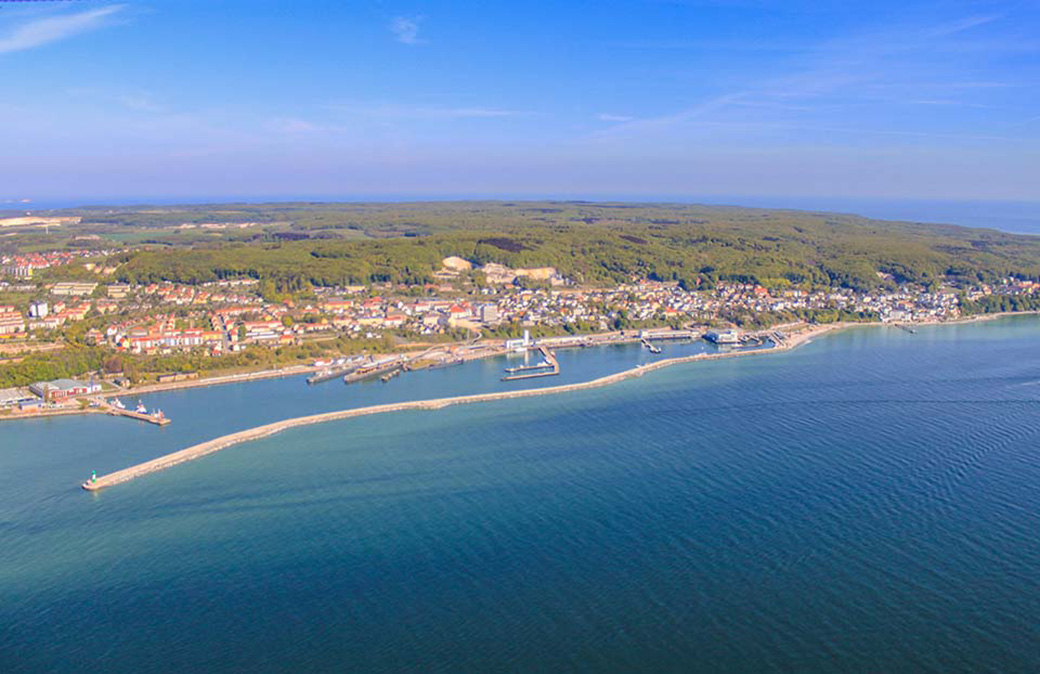 Rundflug: Sassnitz mit der langen Außenmole zum Schutz des Hafens.