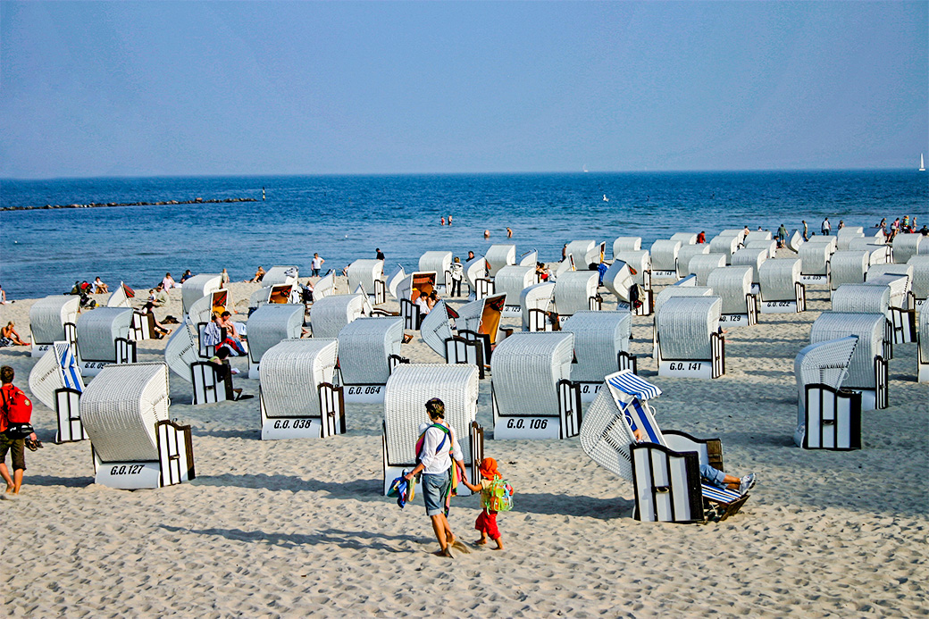 Der Nordstrand an der Seebrücke glänzt mit weißen Strandkörben.