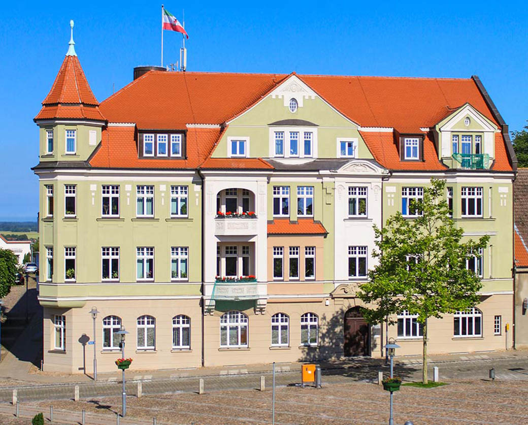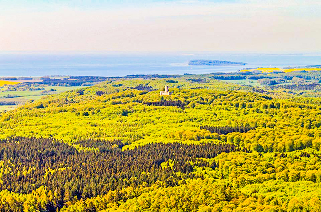 Rundflug: Die Wälder der Granitz mit dem Jagdschloss, im Bodden die Insel Vilm.