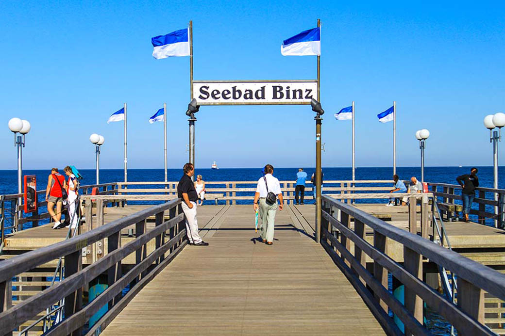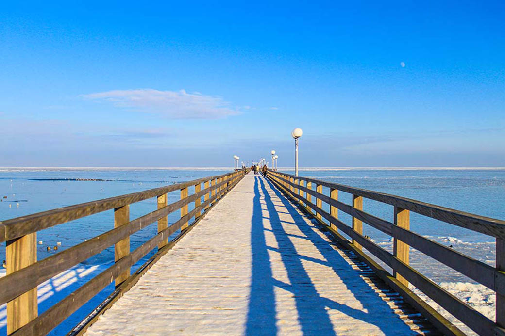 Die Seebrücke im Winter bei Eis und Raureif im Ostseebad Binz.