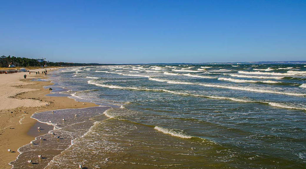 Der Sturm drückt die Wellen und das Wasser weit auf den Strand. Ostseebad Binz.