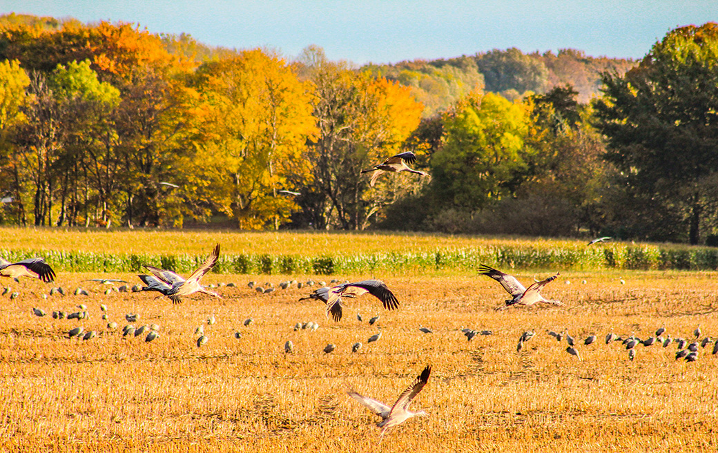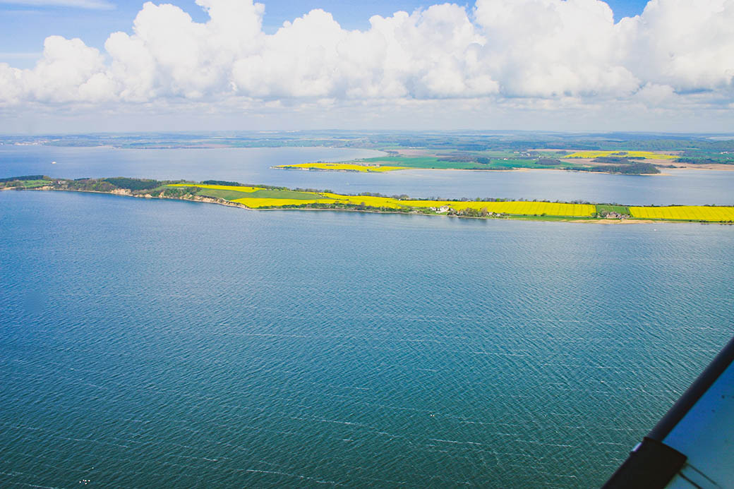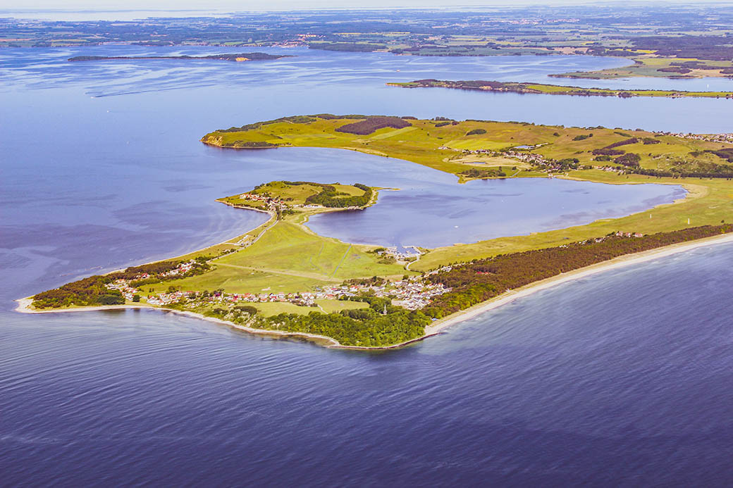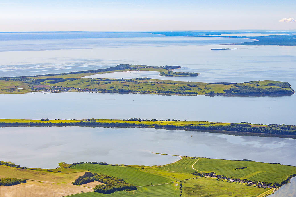 Vorn die Hagensche Wiek, Reddevitzer Höft, dahinter die Having, links davon der Rügische Bodden.
