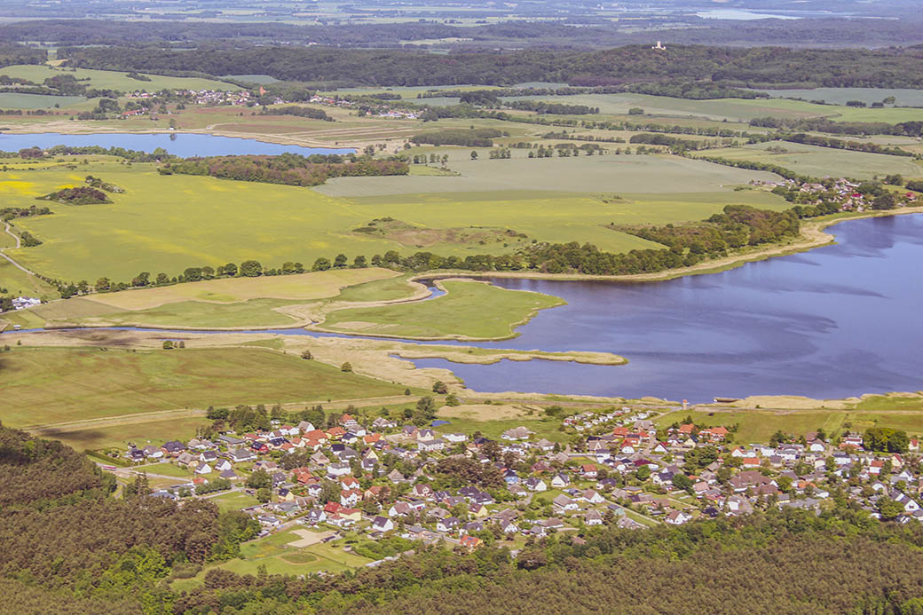 Luftaufnahme von Baabe mit dem Selliner See und ausfahrt zur Having.