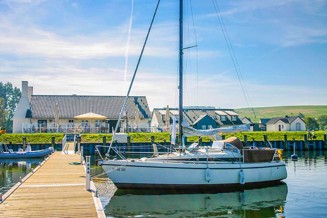Luftaufnahme von Schaprode mit Fähranleger, Personenfähre und Seglerhafen.
