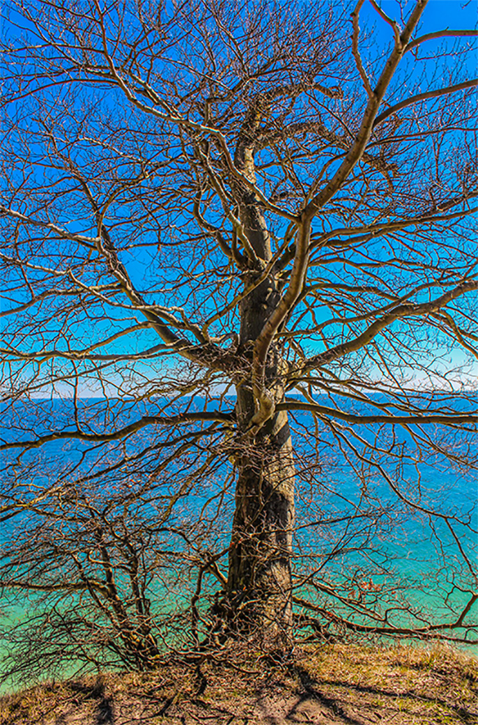 Nationalpark Jasmund: Die schräge Buche an der E-M-A-Sicht ohne Laub im zeitigen Frühjahr.