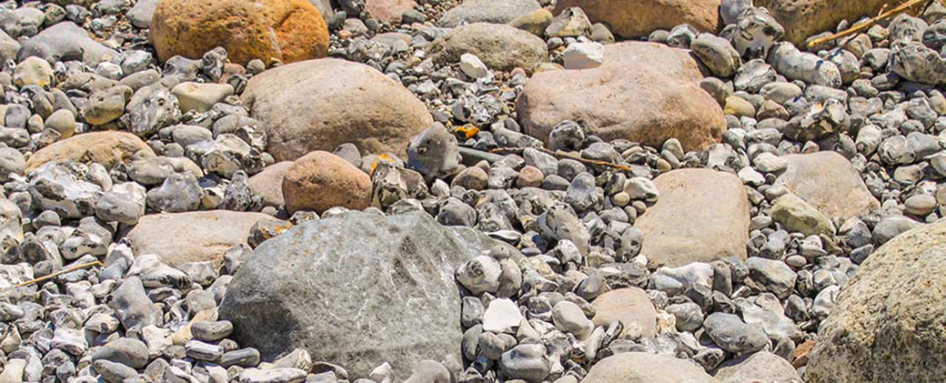 Nationalpark Jasmund: Schwer zu laufender Steinstrand an der Kreideküste.