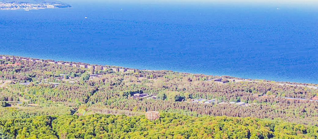 Luftaufnahme von Prora: Baumwipfelpfad mit Adlerhorst, noch nicht sanierte Blöcke von Prora, Ostsee, Sassnitz.
