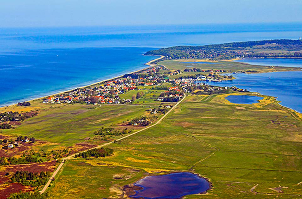 Rundflug: Die Hiddenseer Heide mit Blick über die Insel. Neuendorf, Vitte und Kloster.