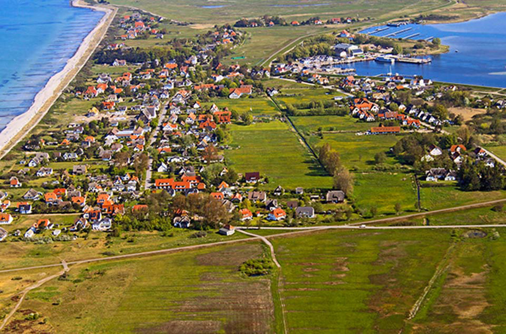 Rundflug: Hiddensee, Vitte mit Hafen und Jachthafen.