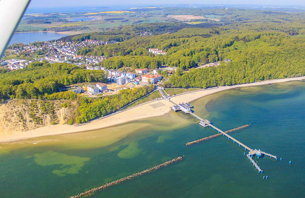 Luftaufnahme vom Göhrener Nordstrand mit Seebrücke und Kurplatz.