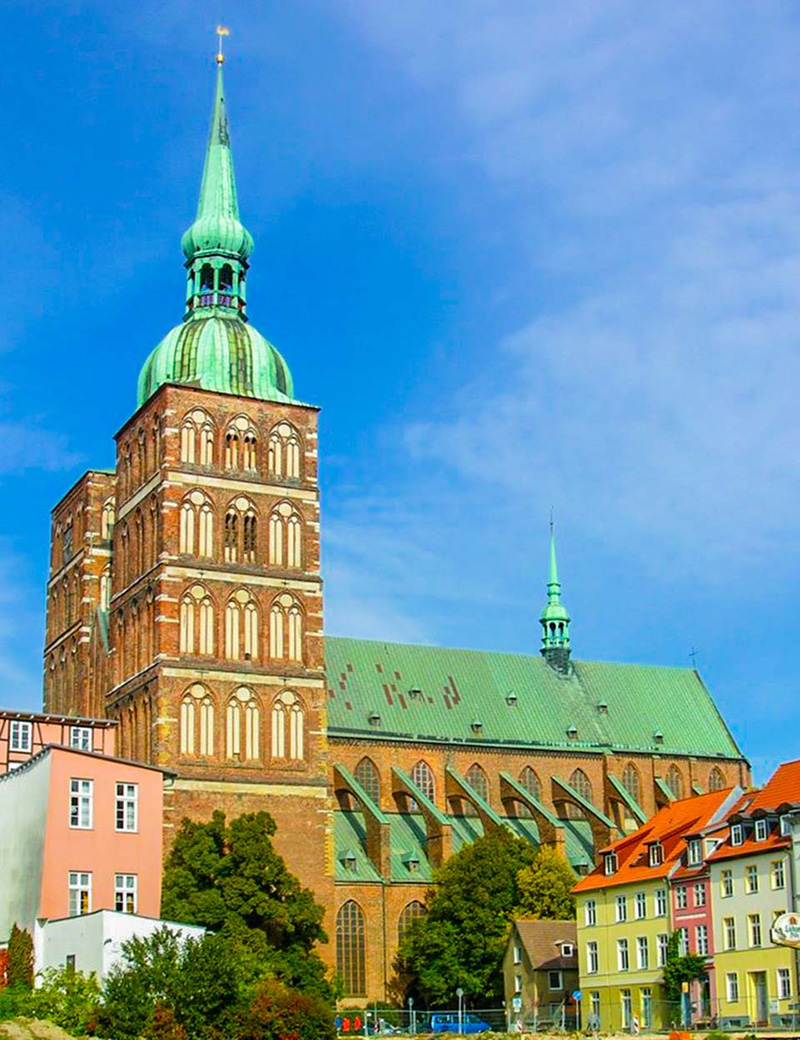 Hansestadt Stralsund:Die Nikolaikirche von der Innenstadt. Heute ist der freie Platz bebaut.